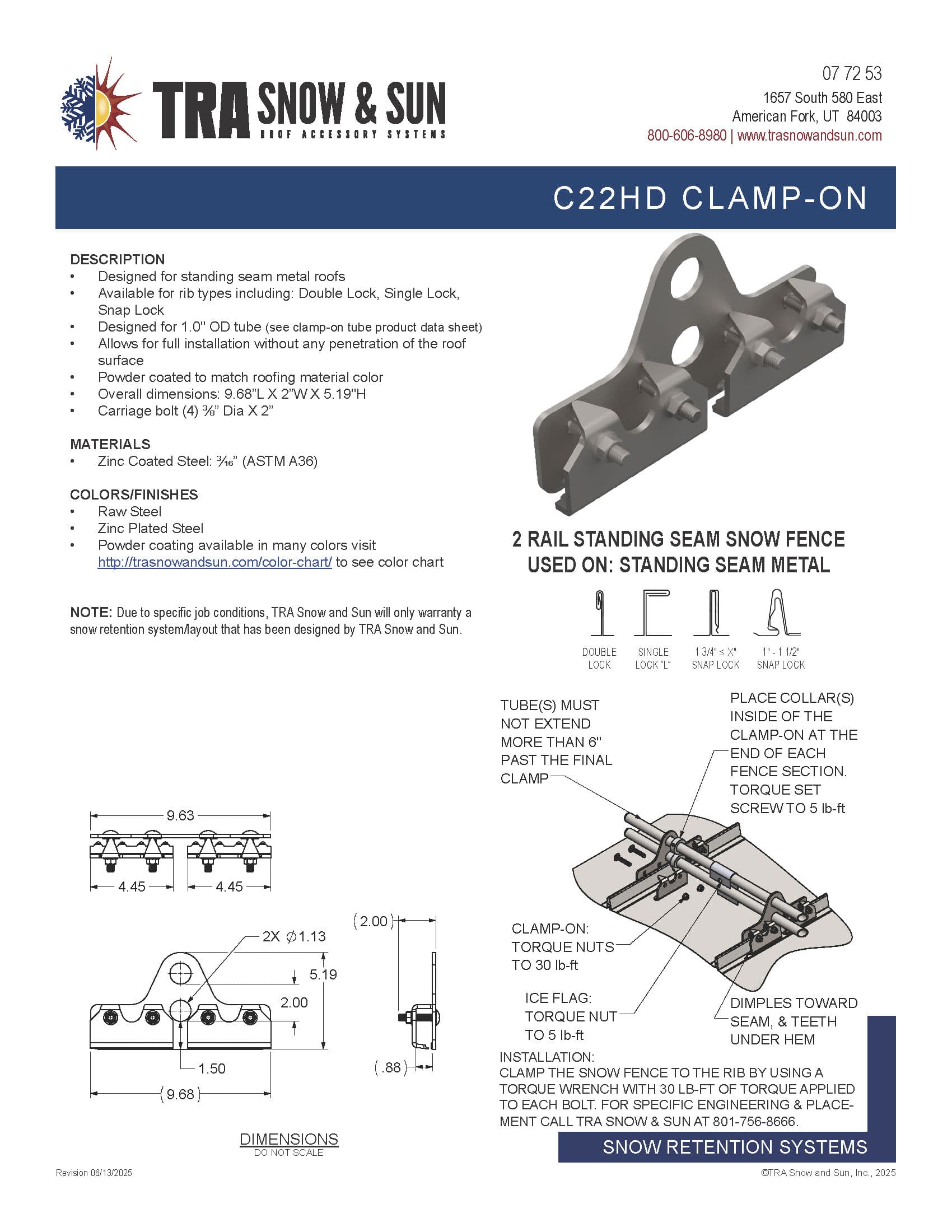 TRA Snow and Sun’s Clamp-on Snow Fence are recognized for their quality and strength.  We manufacture in the heart of the Rocky Mountains and design our systems to retain heavy snow loads.  You can be confident the snow on your roof will stay in place.  Our Clamp-on Snow Fence fits most standing seam profiles using a safe, reliable and attractive design. Our exclusive attachment system, using under-the-hem clamping and bolting, provides superior strength while maintaining your manufacturer’s warranty. Its attractive appearance and proven performance make TRA Snow and Sun’s Clamp-on Snow Fences ideal for both commercial and residential projects.  Our Clamp-on Snow Fences are available in a variety of materials and color/finishes which provide a system that matches your roof type. And we are pleased to say that they are manufactured in the USA.