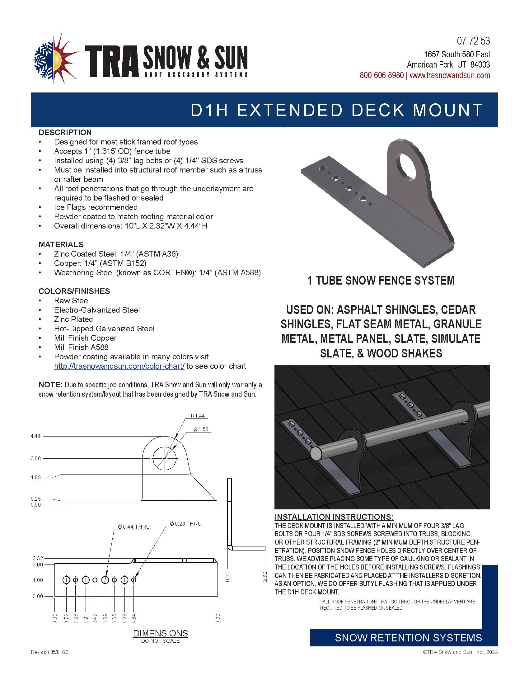 Deck Mount Snow Fences are heavy duty snow retention devices that provide continuous protection using rails, bars, timber, logs or tubes to prevent snow and ice from avalanching off the roof and down to objects or people below. These fences must be attached into the framing member of the roof (typically rafters or trusses).