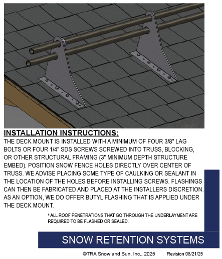 At TRA Snow and Sun we engineer and layout each project free of charge using many factors specific to your roof. We then provide you with the snow retention plan, layout and product details. TRA Snow and Sun representatives will work with you to design the most efficient snow retention system. Fill out our Snow Retention Checklist to get started.