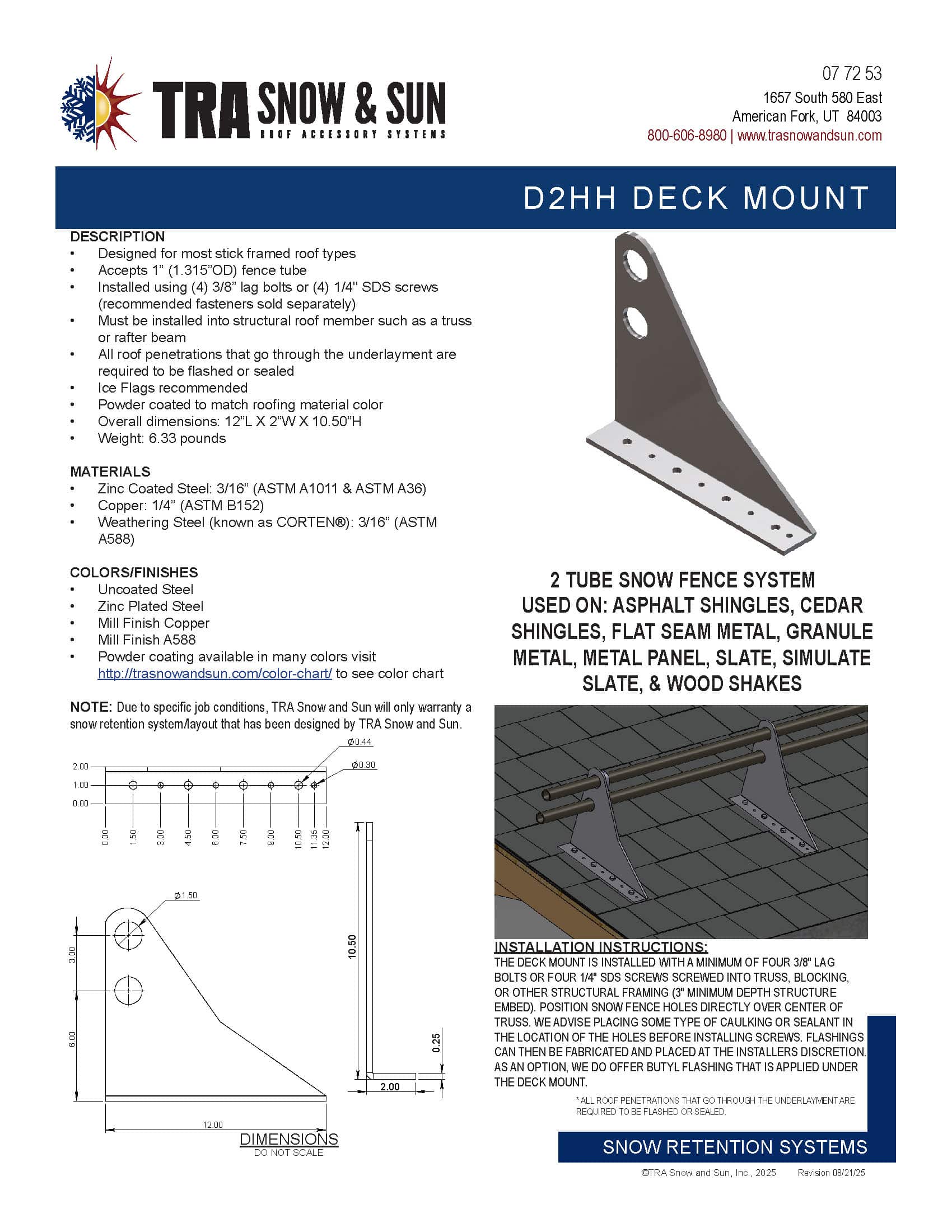 • Installed using (4) 3/8” Lag bolts or (4) 1/4″ SDS screws