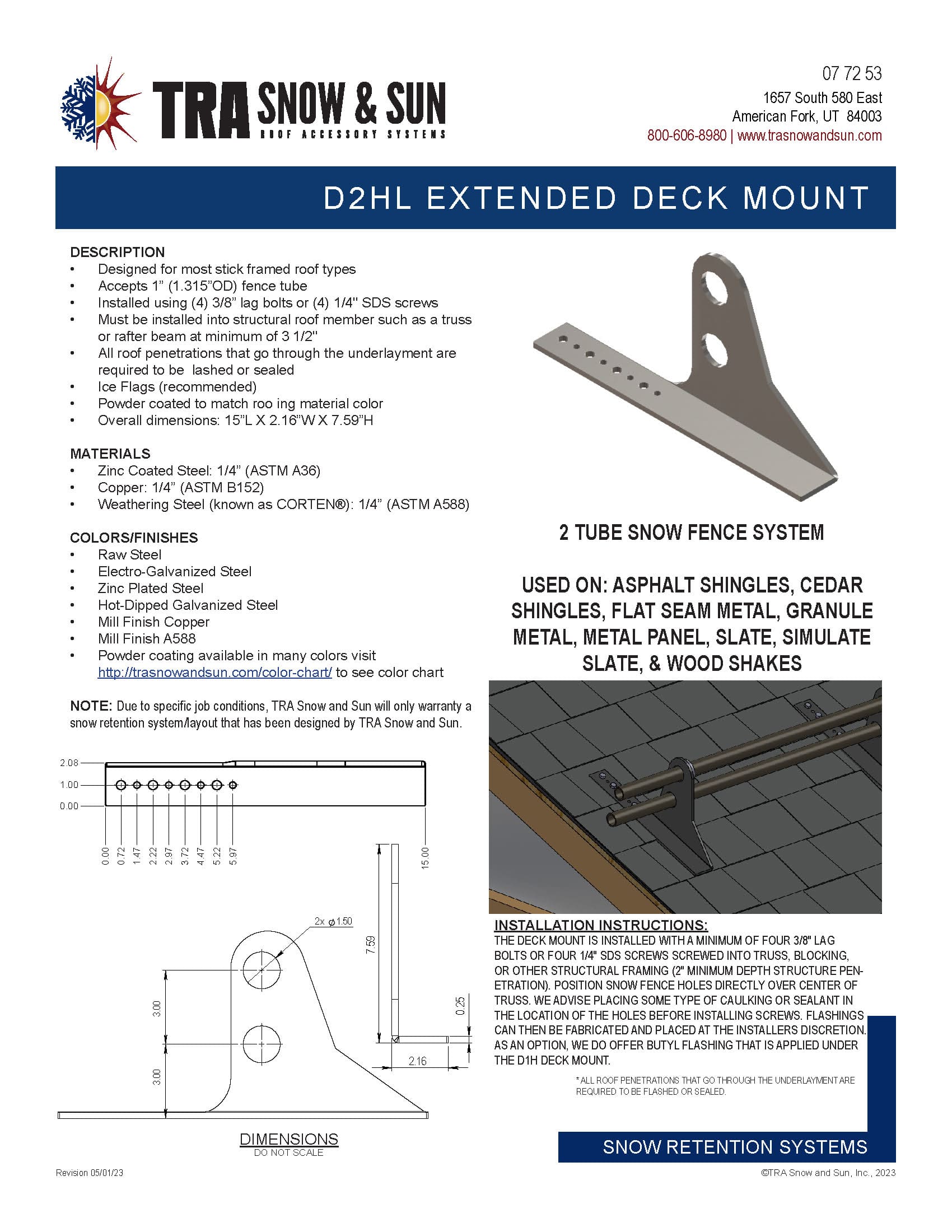 Deck Mount Snow Fences are heavy duty snow retention devices that provide continuous protection using rails, bars, timber, logs or tubes to prevent snow and ice from avalanching off the roof and down to objects or people below. These fences must be attached into the framing member of the roof (typically rafters or trusses).