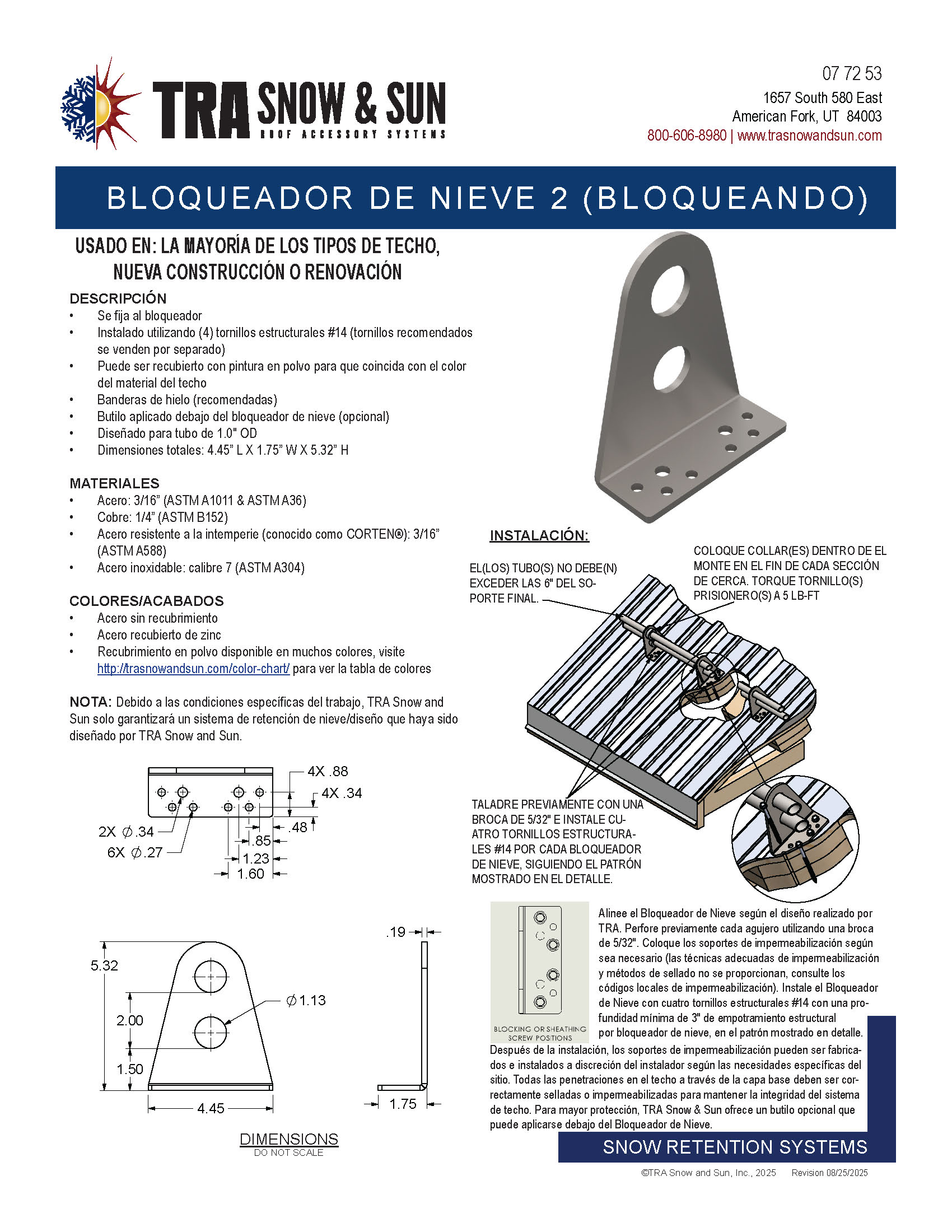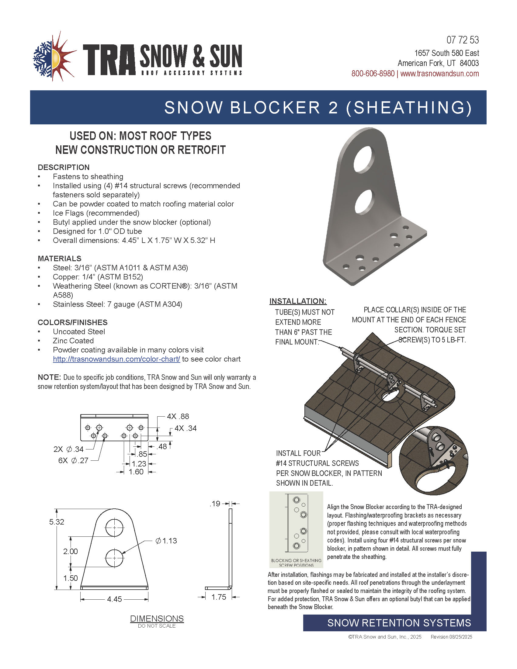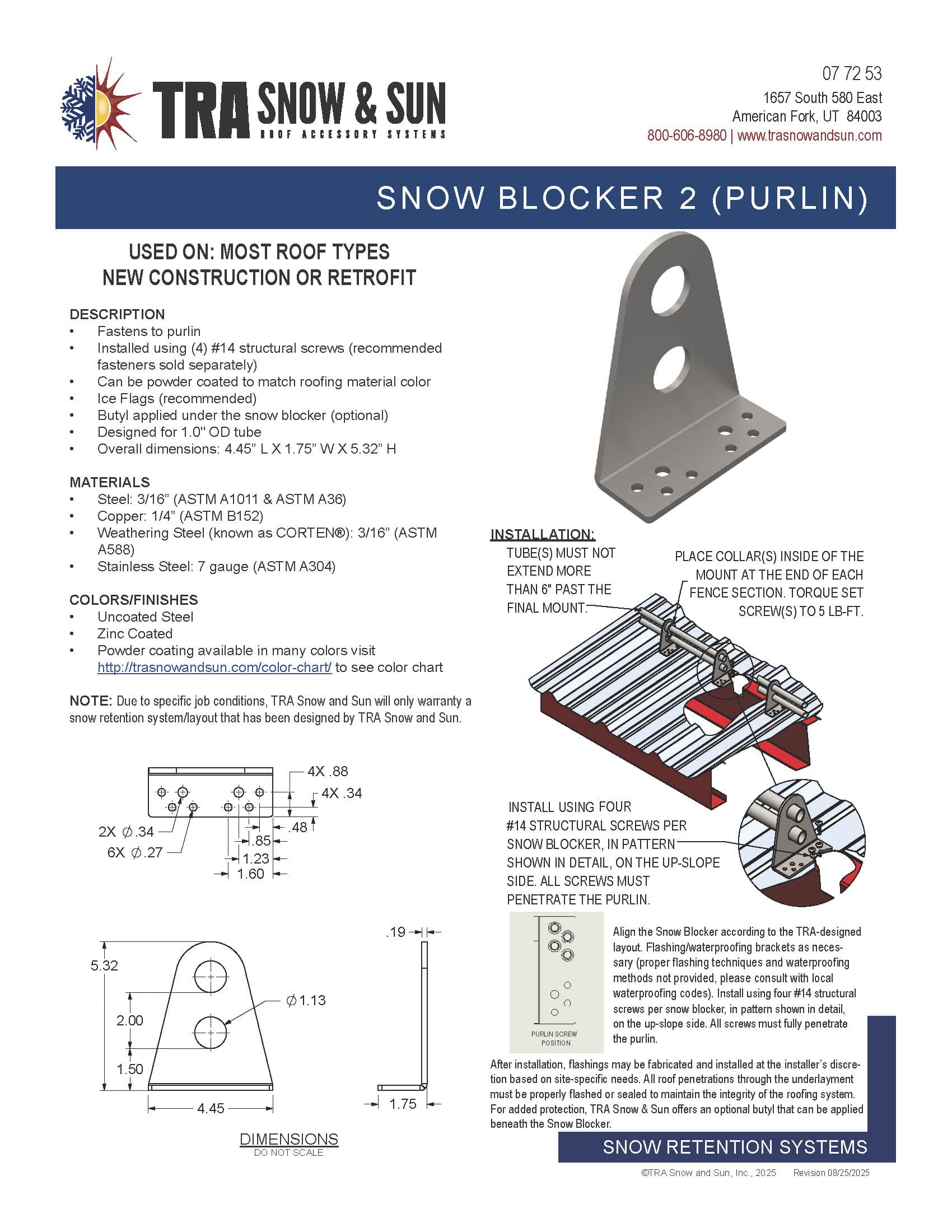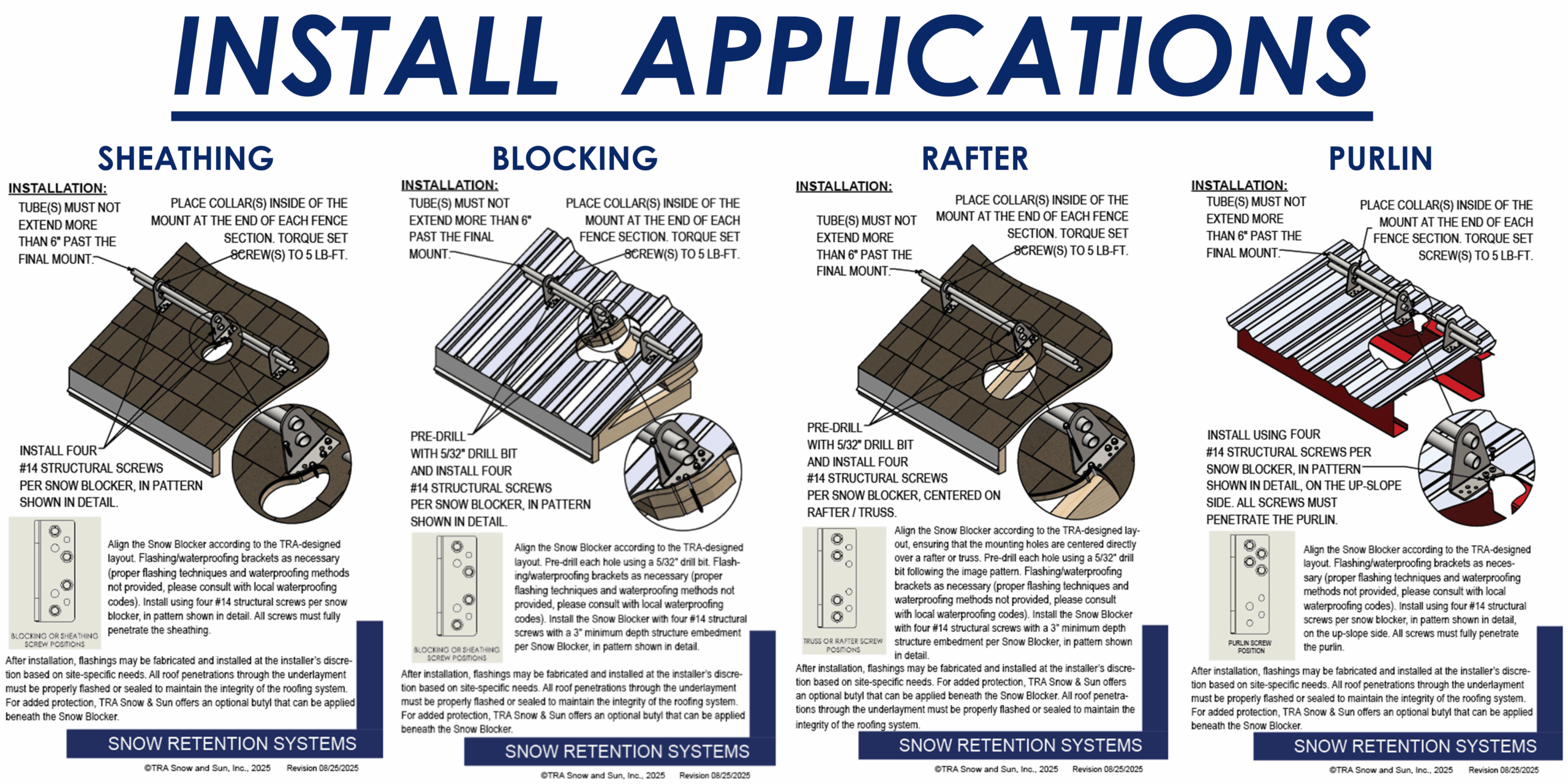 At TRA Snow and Sun we engineer and layout each project free of charge using many factors specific to your roof. We then provide you with the snow retention plan, layout and product details. TRA Snow and Sun representatives will work with you to design the most efficient snow retention system. Fill out our Snow Retention Checklist to get started.