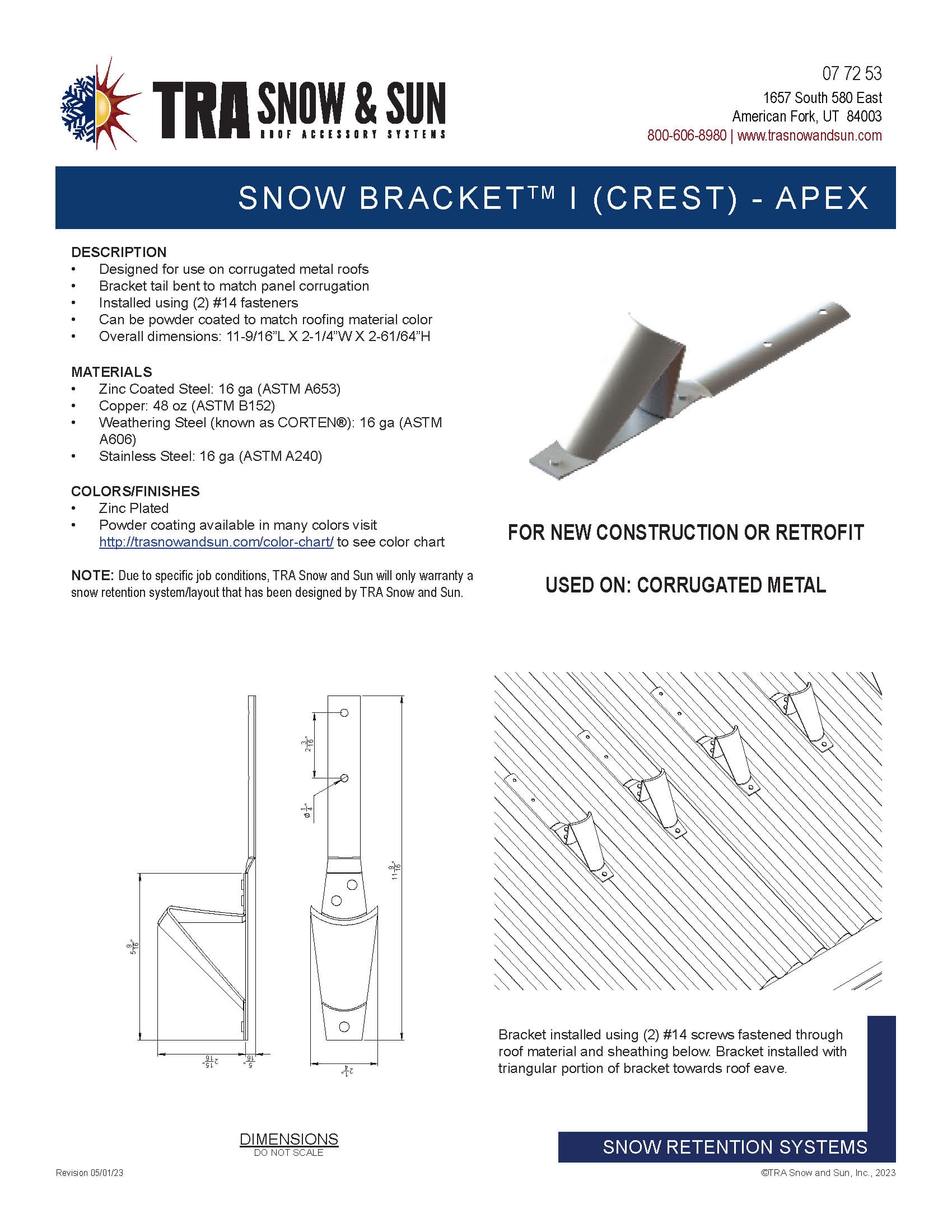Snow Brackets™ for corrugated metal roofs from TRA Snow and Sun are snow guards designed to fit the corrugation on your corrugated metal roof. If you need it to fit the top or the bottom of the corrugation we can do that!